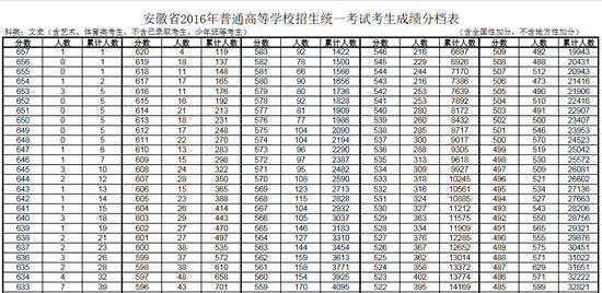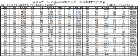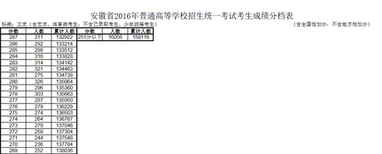2016年安徽普通高校招生考生各分数段人数统计表-普通文科公布。详情如下: