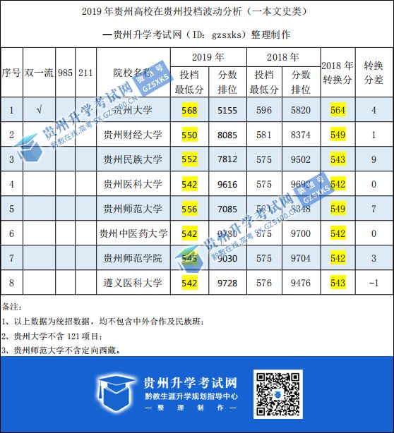 从下图标黄处分数可以看到,幅度变化不大,其中绝对分差值在5分内的学校有6所:贵州大学、贵州财经大学、贵州医科大学、贵州中医药大学、贵州师范学院,遵义医科大学,仅贵州民族大学、贵州师范大学2所学校分差超过5分。2020年的家长可采用此方法,提高学校分析的准确性。