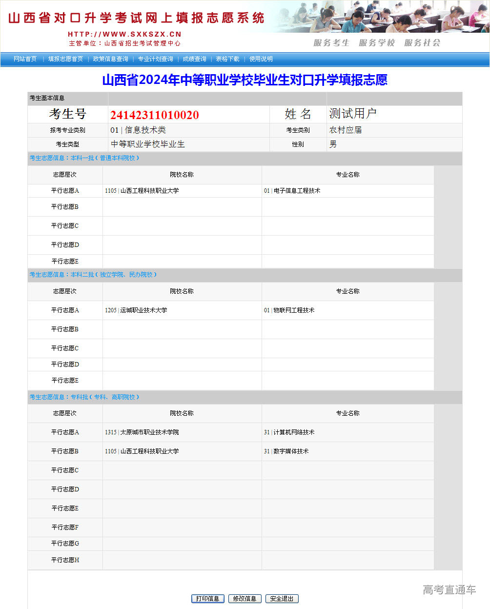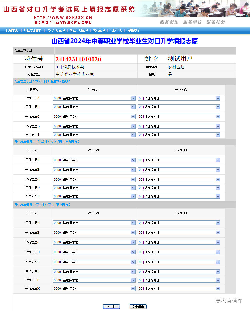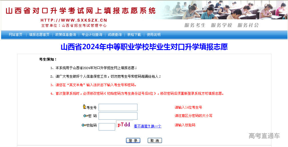 选择“对口升学考试→山西省2024年对口升学网上填报志愿入口”,进入如下界面: