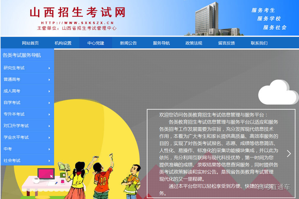 山西招生考试网(http://www.sxkszx.cn)是山西省各类教育招生考试信息发布、信息采集的重要平台,是山西省对口升学考试网上填报志愿的唯一网站。