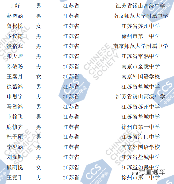 江苏省2020年第34届全国中学生化学竞赛决赛省队名单