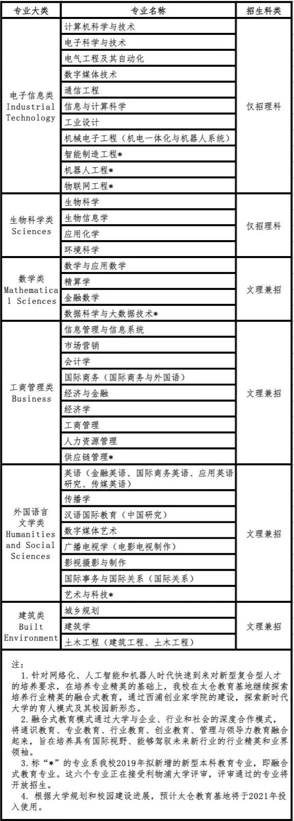 为进一步贯彻落实《国家中长期教育改革和发展规划纲要(2010-2020年)》和《国务院关于深化考试招生制度改革的实施意见》,遵循《教育部办公厅关于做好2019年高校自主招生工作的通知》及广东省招生委员会办公室《关于做好2019年基于高考基础上综合评价招生录取模式试点工作的通知》相关要求,经教育部和广东省教育考试院批准,2019年西交利物浦大学继续在广东省实行高考基础上的综合评价录取模式,综合考量考生高考成绩、高校考核结果、高中学业水平测试成绩、高校自身培养的特色要求等多个维度的内容,探索建立科学的人才评价和人才选拔机制。具体方案如下: 1 领导机构 西交利物浦大学招生工作的领导机构是招生委员会,主要负责制定学校招生计划、确定招生政策和规则、决定重大招生事项等。 2 选拔对象 具有优异的英语语言综合应用能力,认同西交利物浦大学的国际化育人理念与模式,取得2019年普通高等学校招生统一考试报名资格的优秀高中毕业生。 3 招生计划 招生计划:80(以广东省招生办公室最终公布为准) 4 招生专业 西交利物浦大学按照专业大类进行招生。中文专业大类名称仅做填报志愿时使用,准确名称以英文为准。2019年招生专业分为Mathematical Sciences(数学类)、Sciences(生物科学类)、Industrial Technology (电子信息类)、Business(工商管理类)、Built Environment(建筑类)和 Humanities and Social Sciences(外国语言文学类)六个大类。 考生在填报高考志愿时只要选择大类,而非大类内的专业。学生入校后在大一期间选专业或转专业,专业选择和转换规则如下: 满足所选专业的先修课程要求(微积分、多元微积分、线性代数、物理)。 所有新生如要选择建筑学、会计学、经济学、经济与金融、影视摄影与制作、计算机科学与技术、以及信息与计算科学专业,必须在大一第一学期通过相应的专业选择测评,第二学期不可申请转入。 学生在大一第一学期可以自由转入国际商务专业。第二学期申请转入该专业的学生需要已修读至二级西班牙语/日语课程。 仅录取到数学大类的学生可在第一学期自由选择金融数学专业。第二学期申请转入金融数学专业的学生,除选修专业教学计划要求的先修课程外,还必须达到第一学年加权平均分70分及以上。 对于其他无专业选择测评或无附加录取要求的专业,原则上学生只要满足专业先修课程要求,便可分别在大一第一学期和第二学期学校规定时间内在大类内外根据兴趣与规划自由选择或转换专业。在特殊情况下,当某专业申请人数超过该专业最大容量且资源无法保障的情况下,学校有权利增加专业选择测评的环节。