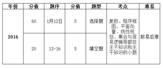 在全国卷理科数学中,选择题与填空题试题分值都比较稳定,题目固定:选择题12题,填空题4题。