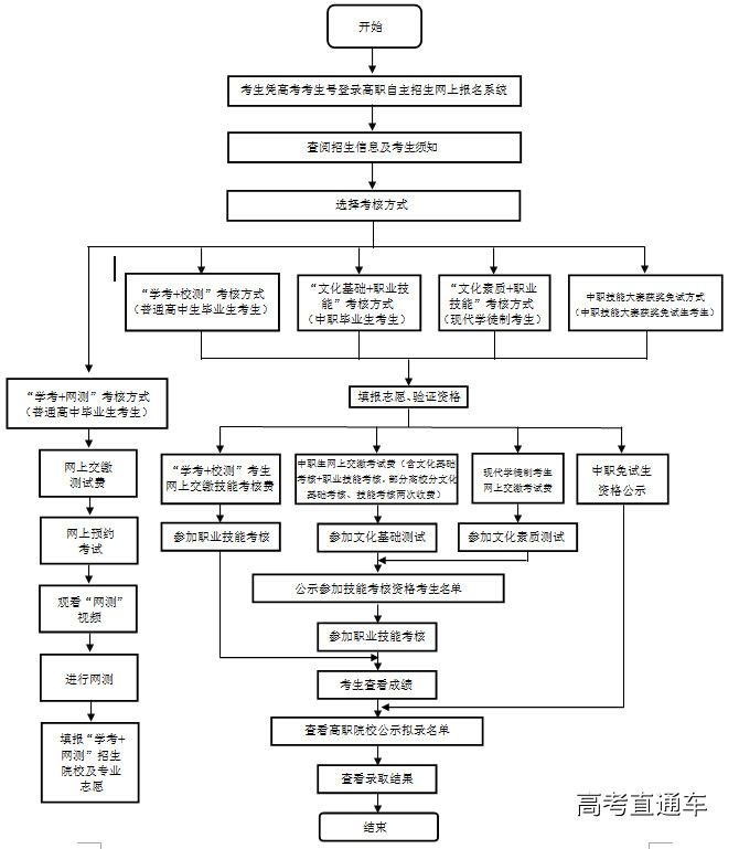 考生可根据本人报考条件,在“学考+网测”(面向普通高中毕业生)、“学考+校测” (面向普通高中毕业生)及“文化基础+职业技能”(面向中职毕业生)、“现代学徒制”(面向普通高中毕业生、中职毕业生)、“中职技能大赛获奖免试生”五种考核方式中选择一种进行报考。
