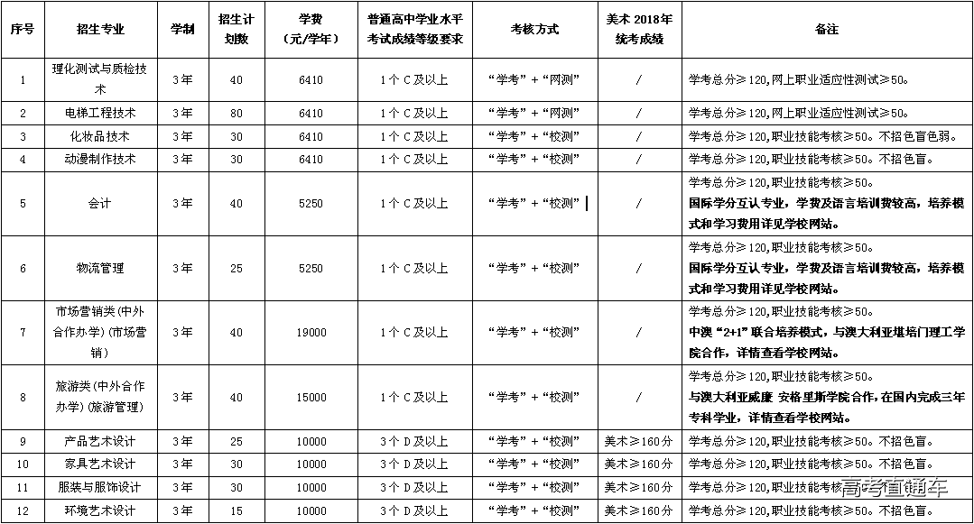 1.普通高中毕业生采取“文化素质考试+职业适应性测试”的考核形式,均由学校自主命题和组织实施。文化素质考试和职业适应性测试的权重比例为2:1,入学测试总分满分值为300分,其中文化素质考试满分值为200分,职业适应性测试满分值为100分。