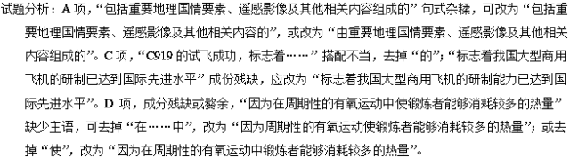 【名师点睛】本题考查辨析病句的能力,采用的是山东高考一贯使用的独立辨析形式,属于传统题型,指向明确,难度适中,考点比较全面。这类题目解答时首先应熟知病句的类型,最常用的判别方法是划分句子结构成分,先看主谓宾,再看定状补,判断句子是否存在成分残缺赘余、搭配不当、结构混乱、语序不当等问题。如果结构上没有问题,可从逻辑意义上分析,看是否有表意不明、句意关系不当等问题。还有一个简捷的方法便是借助标志法,比如,如果句中出现关联词,可从关联词的搭配、语序、逻辑等三个方面考虑;如果出现介词,可从主语残缺、中途易辙、主客颠倒等角度考虑。本题A项将“包括重要地理国情要素、遥感影像及其他相关内容的”和“由重要地理国情要素、遥感影像及其他相关内容组成的”糅合到一起,设置了句式杂糅类语病;C项“标志”的主语应是“C919试飞成功”,而不是“试飞成功”,故此处属于搭配不当,“达到国际先进水平”的主语应是“能力”之类,句中缺失,所以此处属于成分残缺,应补出;D项“因为在周期性的有氧运动中使锻炼者能够消耗较多的热量”同时使用了“在……中”和“使”,造成了句子缺少主语,所以此选项既可以看成是成分赘余类语病,也可以看作是成分残缺类语病。