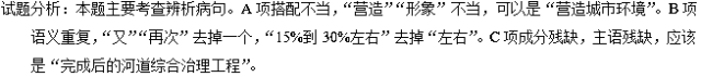 【名师点睛】语病主要分为两大类:结构性语病和语义性语病,本题主要考查结构性语病。要认真细致审读每个选项,重点注意分析并列短语作句子成分与其他成分的搭配,可以将并列短语拆开逐一与其他成分搭配,验证其当否。如本题A项搭配不当,“营造”“形象”不当,应该是“营造城市环境”。对于句式杂糅的句子,先凭语感判定其不协调之处,再分别造句,放回原文中,验证其当否。对于语序不当的句子,也要先凭语感检测,再将不协调的词语或句子调换位置,看是否通畅自然。对因不明词义而造成前后矛盾的语句,应尽力推敲出这个关键词语的含义,推敲方法是拆字组词。对逻辑概念方面的不协调,可以凭事理推断。如B项语义重复,“又”“再次”去掉一个,表区间的“15%到30%”后不能再跟“左右”。注意题干的要求,究竟选择的是有语病还是无语病的一项。