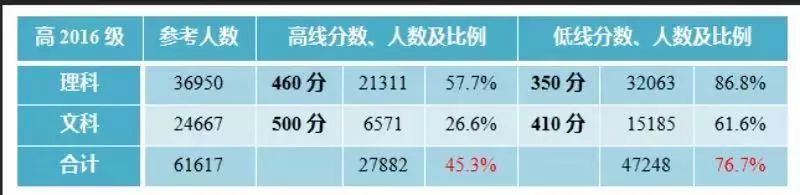 据悉,高2016级零诊,全市理科参考人数36950人,57.7%的人上了高线,低线人数占比86.8%;全市文科参考人数24667,高线人数占比26.6%,低线人数占比61.6%。