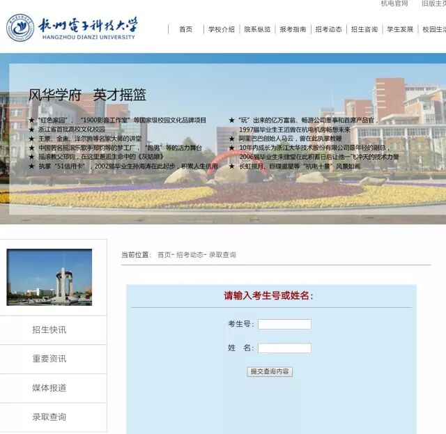 01 官网查询 登陆杭电本科招生网,输入考生号或者姓名进行查询,查询链接: http://zhaosheng.hdu.edu.cn/list.php?cid=114 (具体数据以浙江省考试院公布为准) 02 微信查询 点击联系我们-三位一体 03 新生咨询群 为便于考生及家长了解专业信息及高考志愿咨询服务,以及我校的学习、生活、高考录取信息等情况,已查询到录取结果的考生,可加入答疑总群或相应的学院新生群了解更多专业相关情况况。 新生咨询群 杭电2018级新生群01群:125799991 杭电2018级新生群02群:125799992 杭电2018级新生群03群:125799993 杭电2018级新生群04群:125799994 注:以上为我校所有官方新生群,请各位考生及家长切勿相信其他任何非官方新生群的言论。请同学们不要重复加群,每个群我们都安排了答疑人员为你们答疑解惑。加群的同学请自觉遵守法律法规,不发布不良言论和虚假信息。