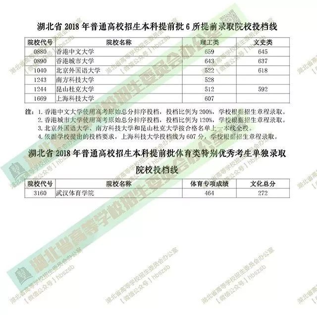 湖北省2018年普通高校招生本科提前批提前录取院校投档线