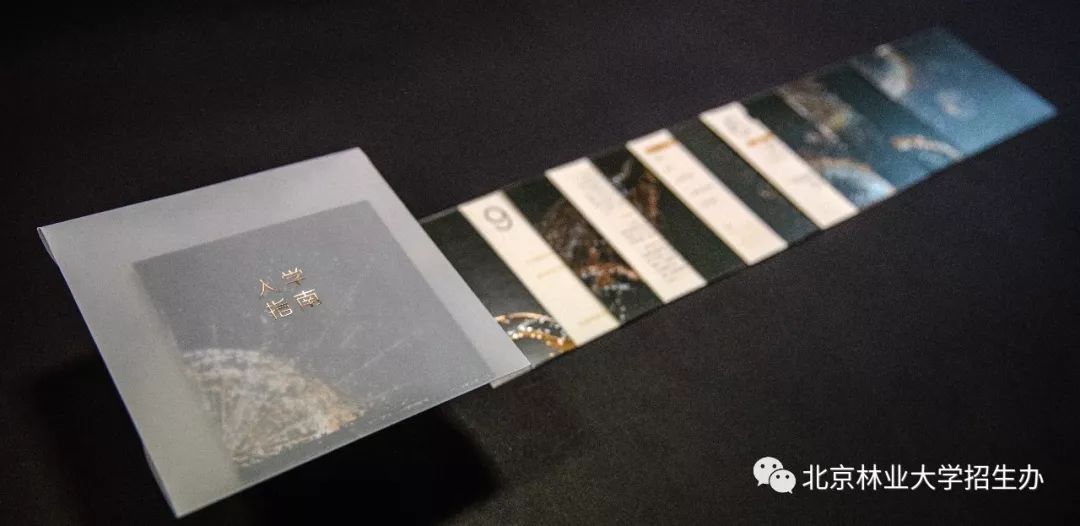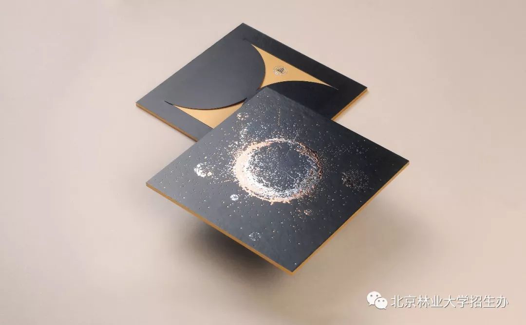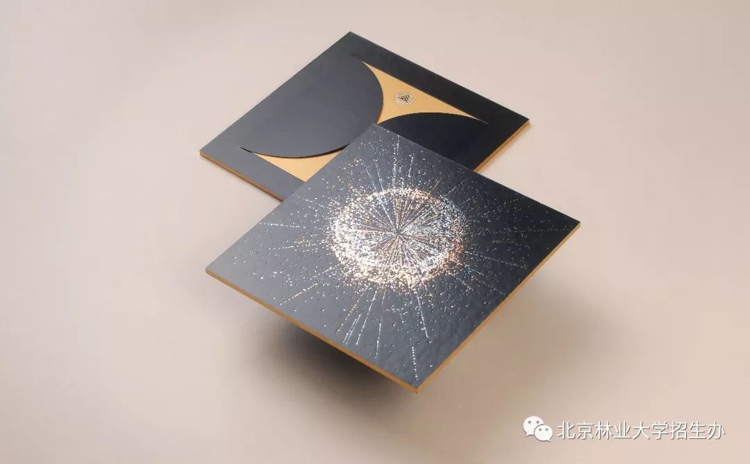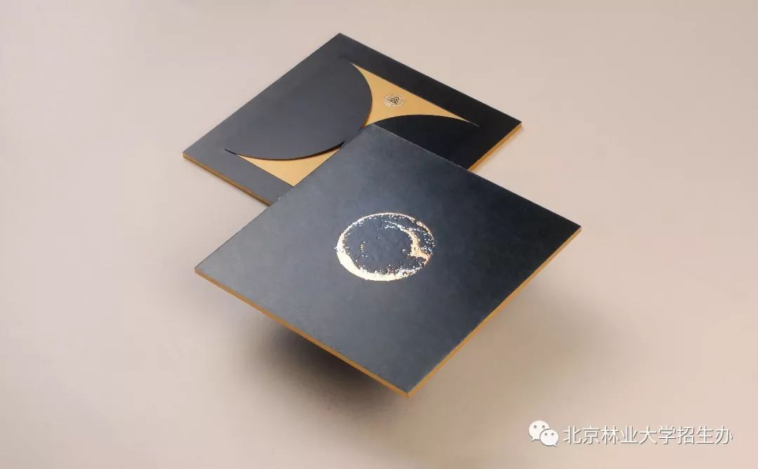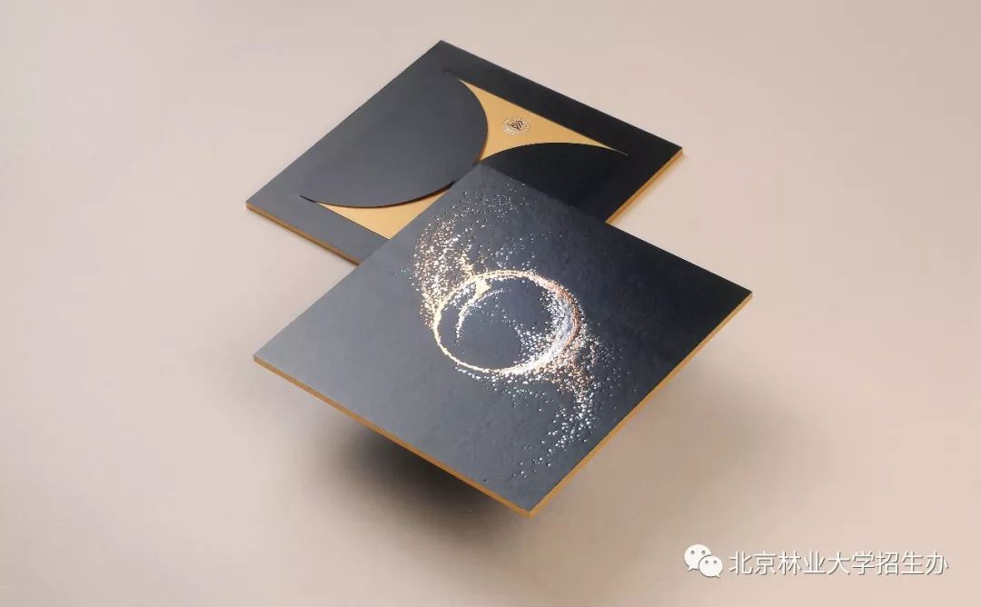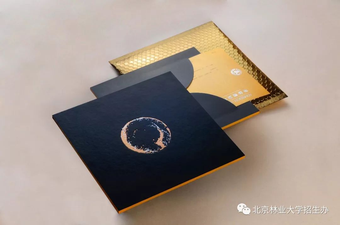 录取通知书的主色调是墨绿、玫瑰金、银,形状是象征天地的圆与方。
