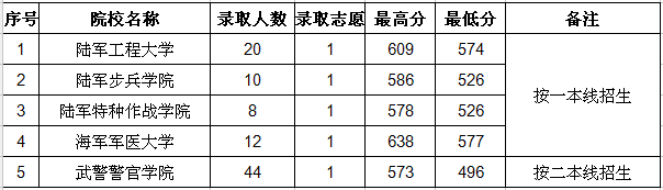注:1.军队、公安高校录取是从面试、军检、体能测试、政审合格的生源中按考生志愿从高分到低分投档,高校择优录取。