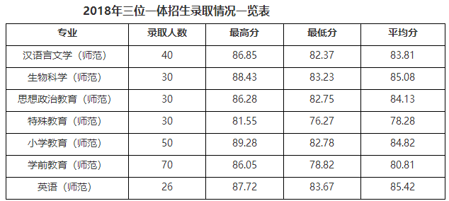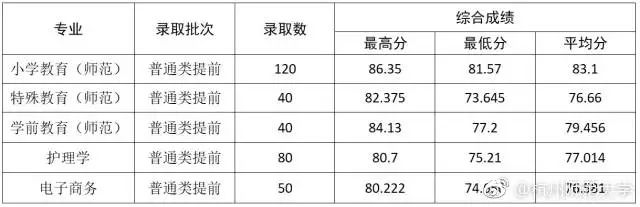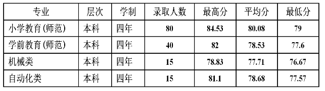 现代科技学院普通类提前 60 80.878833 76.2375 78.3826 专业名称 录取人数 录取最低综合分 小学教育(师范) 35 79.085 历史学(师范) 15 78.426 汉语言文学(师范) 15 80.514 数学与应用数学(师范) 20 79.057 物理学(师范) 10 77.614 英语(师范) 20 78.669 油气储运工程 10 77.4 化学工程与工艺 10 78.149 船舶与海洋工程 10 76.925 水产养殖学 5 76.724 专业 计划数 录取数 三位一体综合分 最高分 最低分 平均分 英语类 10 10 77.227333 73.996667 75.353067 化工与制药类 15 15 76.727333 72.531333 74.619067 经济与贸易类(中外合作办学)(国际经济与贸易(中美合作办学)) 15 15 75.566667 70.405333 72.671867 金融学类(中外合作办学)(金融学(中美合作办学)) 10 10 76.173333 64.460667 70.564533
