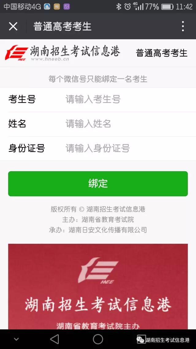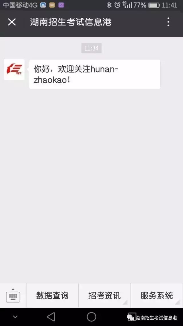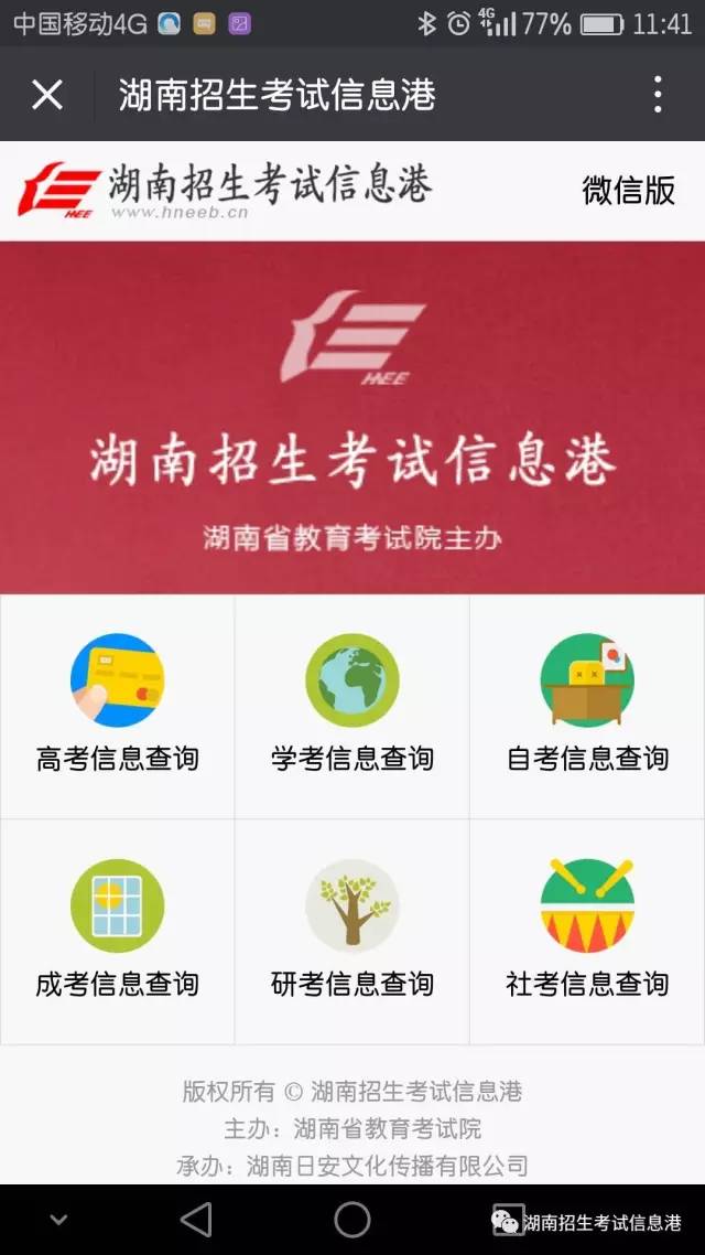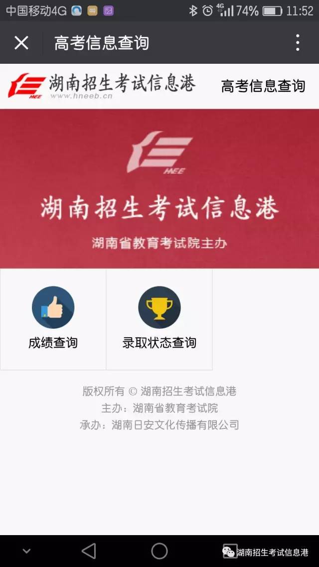 一、网站查询: 湖南招生考试信息港(http://www.hneeb.cn) 二、短信查询: 湖南移动用户通过发送“LQZT#”加“考生号”的后10位(如:LQZT#0102030405)到1065899266查询; 湖南联通用户发送“GKLQDT#”加“考生号后10位”(如GKLQDT#0102030405)到1062899266查询。 三、通过“湖南招生考试信息港”微信公众号查询: 01 关注“湖南招生考试信息港”微信公众号;微信-搜索-公众号“湖南招生考试信息港” 或“ hunan-zhaokao”,点“关注”进入“湖南招生考试信息港”微信公众号。已关注的考生直接进入下一步。 02 在“湖南招生考试信息港”微信公众号中点击屏幕左下角“数据查询”菜单进入“湖南招生考试信息港”微信版页面; 03 点击“高考信息查询”,再点击“录取状态查询”功能按钮; 04 输入考生的“考生号”、“姓名”、“身份证号”进行绑定。绑定成功后,即可进行查询。(已绑定成绩查询的考生可以直接查询录取状态)