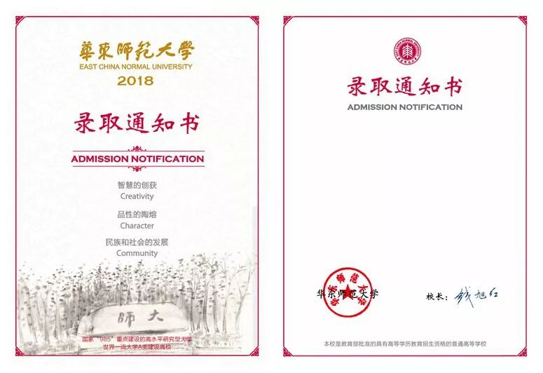 通知书设计风格与2018年华东师大推出的《专业师大》一致。今年招生季,华东师大招办向重点中学发放3千余册《专业师大》帮助考生报考。
