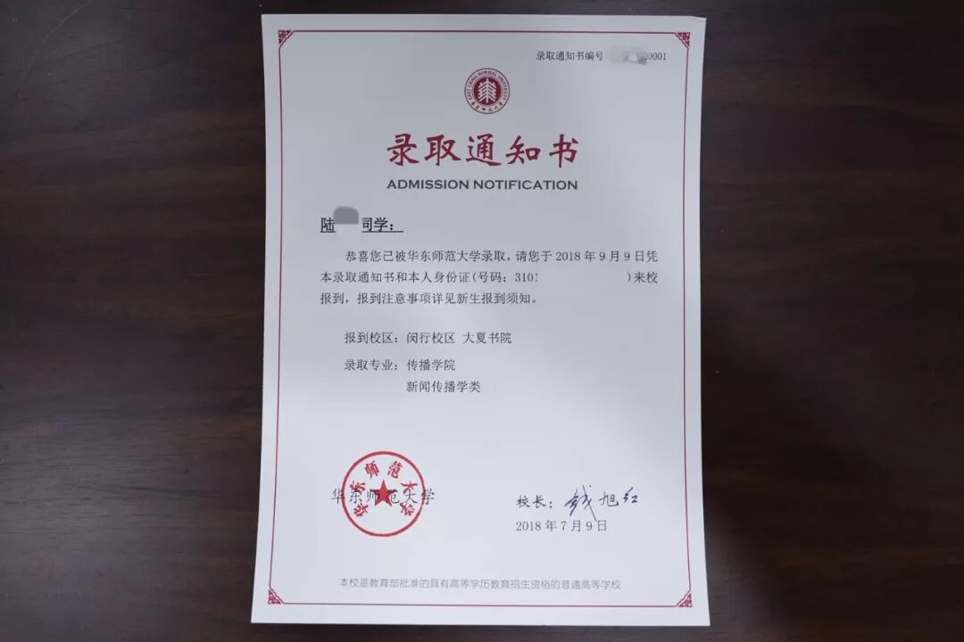 2018年发出的第一封录取通知书,通知书编号尾号为 0001,是上海市“综合评价批次”录取的陆同学,录取专业为:新闻传播学类,陆同学将于9月9日在闵行校区报到入学。