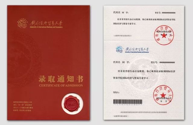 “UIBE” 印迹是对外经济贸易大学高考录取通知书的核心设计理念。首先, “UIBE”印迹寓意贸大对学子昨日风采的肯定,殷切欢迎学子加盟惠园(UIBE),扬帆起航,再创辉煌;其次,“UIBE”印迹本身就代表一种属性、一种认可,印证了学子在学习生涯中一个新篇章的开始; 再次,“UIBE”印迹增强了学生的归属感和认可度,印证着在未来求学中UIBE会和你共同努力,实现自身价值,期望你们每一个人都能成为国家的栋梁之材。