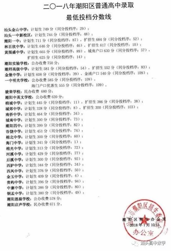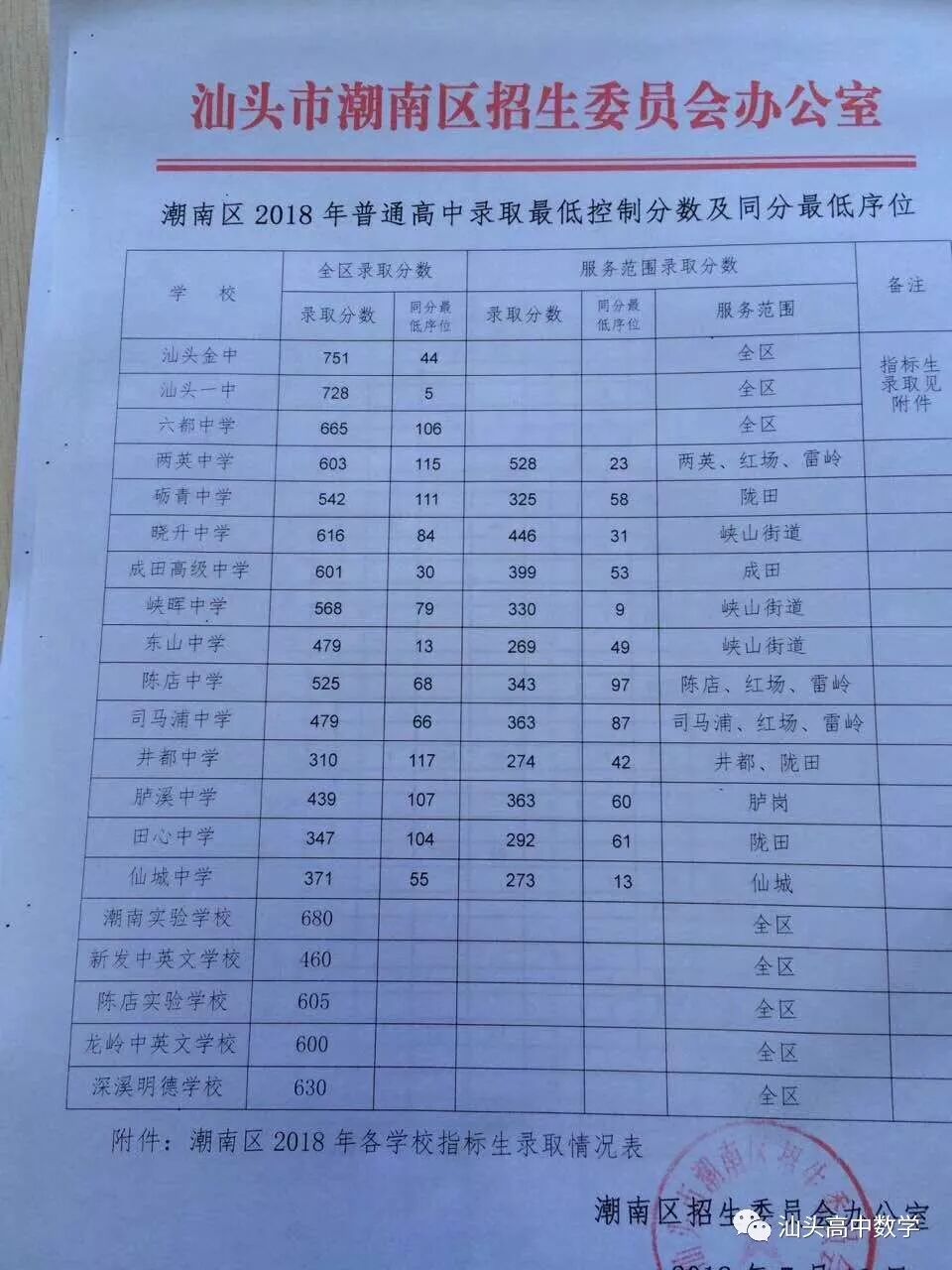 【2018年潮阳区普通高中录取最低分数及同分最低序位】