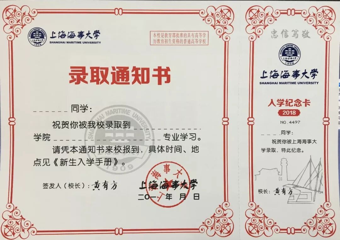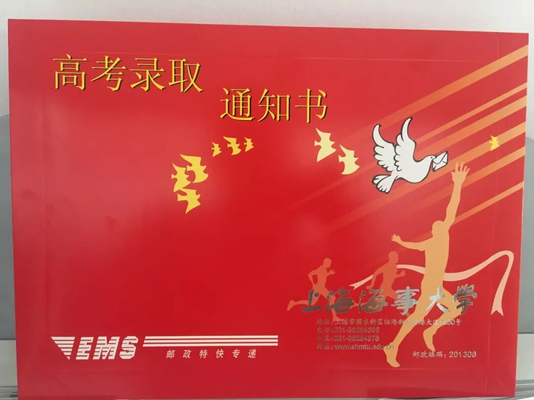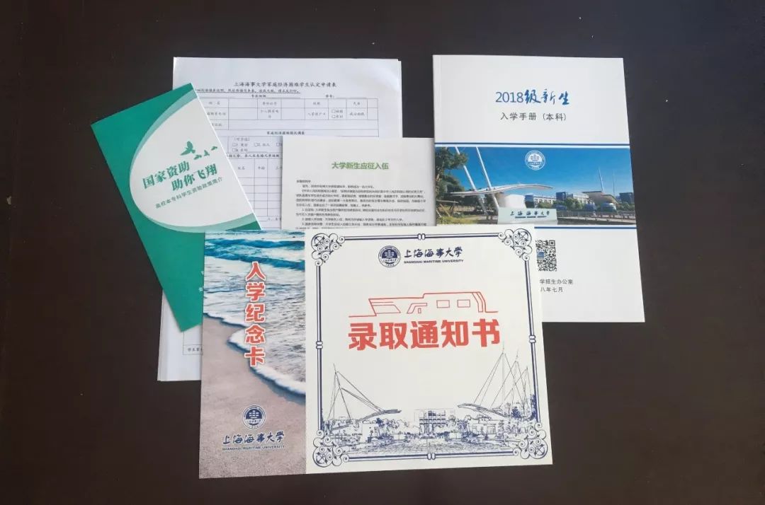 2018年上海海事大学首批通知书已经于7月13日16:00寄出,将有223名来自全国各地的准大学生收到我校首批录取通知书,他们的加入将给海大注入新的生命力。 首批录取通知书批次分别是: 上海市艺术类批次 上海市提前批次 甘肃省提前批次 广西壮族自治区提前批次 在EMS的红色信件里“藏”着上海海事大学的录取通知书,上海海事大学2018年高考录取通知书在往年模板的基础上,加以创新,红色的条纹边框,简单又不失大气,在四角融入了锚的元素,配上学校的校徽,表明了我校是一所以航运、物流、海洋为特色,具有工学、管理学、经济学、法学、文学、理学和艺术学等学科门类的多科性大学,“高级航运物流人才的摇篮”盛誉实至名归。 海大录取通知书 “录取通知书”五个大字采用红色,非常醒目,正文部分言简意赅,明确注明录取人姓名、录取学院、专业,下方有黄有方校长的签字和上海海事大学的印章,庄重大气。还有一张特制的入学纪念卡,在2018年份下面有专属编号,每一位新生都有不同的编号,以学校大门、灯塔为图案素材,以及校训“忠信笃敬”为背景,象征着百年学府张臂拥抱莘莘学子,进入海大,秉承校训,以灯塔为指引,奔向属于自己的光明前程。 除了海大录取通知书以外,里面还有 2018级新生入学手册 大学新生应征入伍宣传单 大学生资助手册 中国银行银行卡 上海海事大学家庭经济困难学生认定申请表及填表说明