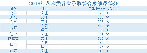 2018年艺术类各省录取综合成绩最低分如下(截止7.12)