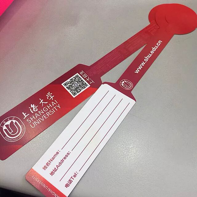 把上海大学的行李签别在行囊上,渐变的红色笺纸上印有上大建筑物的暗纹,白色的校徽简约而大气。上大的怀抱已经向你敞开,趁风轻云朗,青春正好,赶快出发吧!