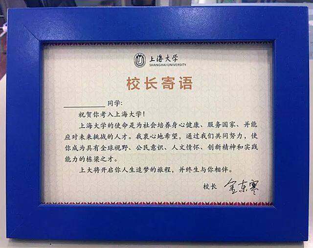 希望你在上海大学的四年里能不负青春,践行“自强不息”,“先天下之忧而忧,后天下之乐而乐”的校训精神,成为具有全球视野、公民意识、人文情怀、创新精神、实践能力,并能应对未来挑战的栋梁之材!