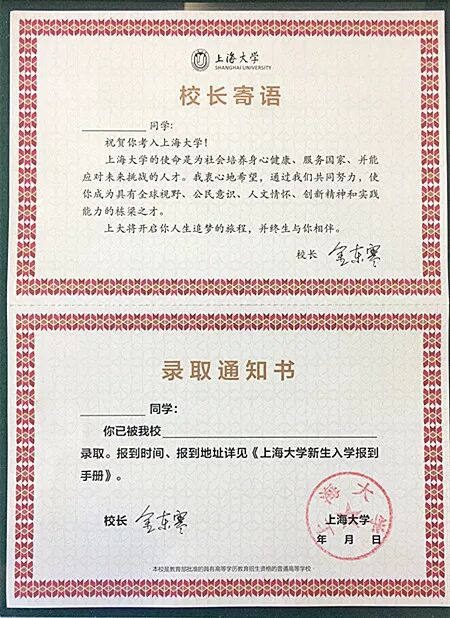 录取通知书封面上精巧地用金线手绘勾勒出上大建筑的线条,特意做成贺卡的模样,是庆祝你经受住了十二年的寒窗苦读而终有所得,也是祝福你即将开启更绚烂的未来。