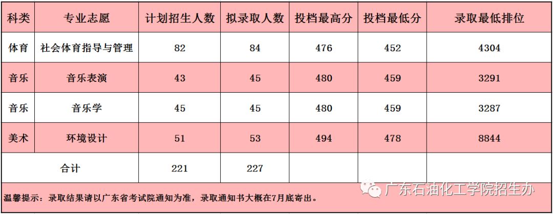 广东省2018年本科体育、艺术类于7月13日开始投档,我校体育、艺术类录取工作都已圆满结束。考生报考我校本科批次体育、艺术类热情高涨,第一志愿已全部录满。其中,体育类最高投档分476分,最低投档分452分;美术类最高投档分494分,最低投档分478分;音乐类最高投档分480分,最低投档分459分。我校投档录取详情见下表。 广东石油化工学院2018年本科批次 体育艺术类投档录取一览表