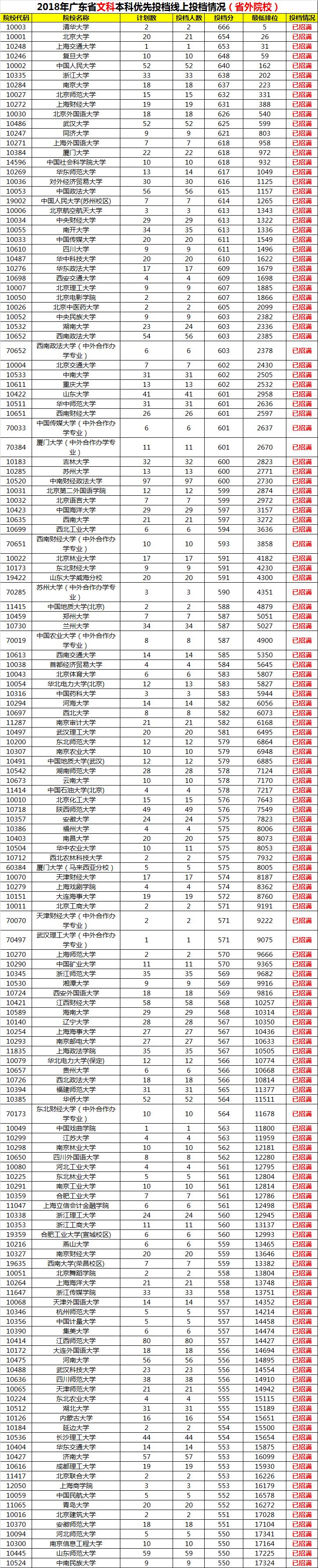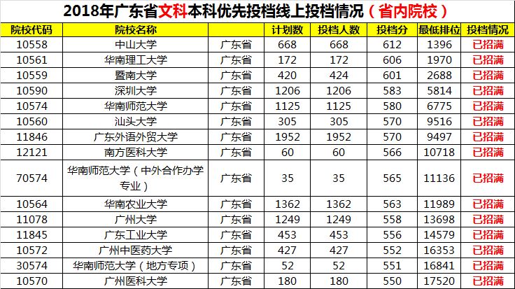 2018年优先投档详细情况 优先投档文科(已经招满学校) 广东省内院校 省外院校 优先投档文科(没有招满的学校) 广东省内院校 省外院校 优先投档理科(已经招满学校) 广东省内院校