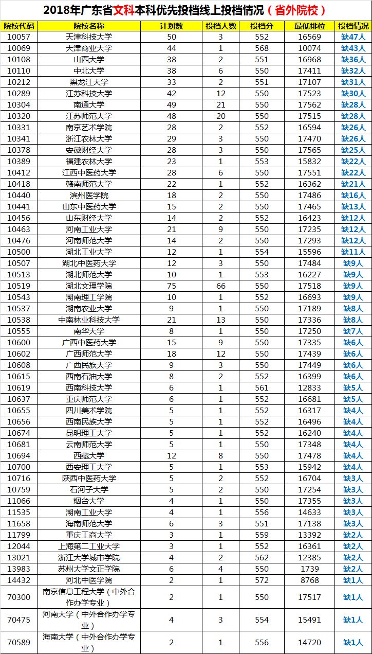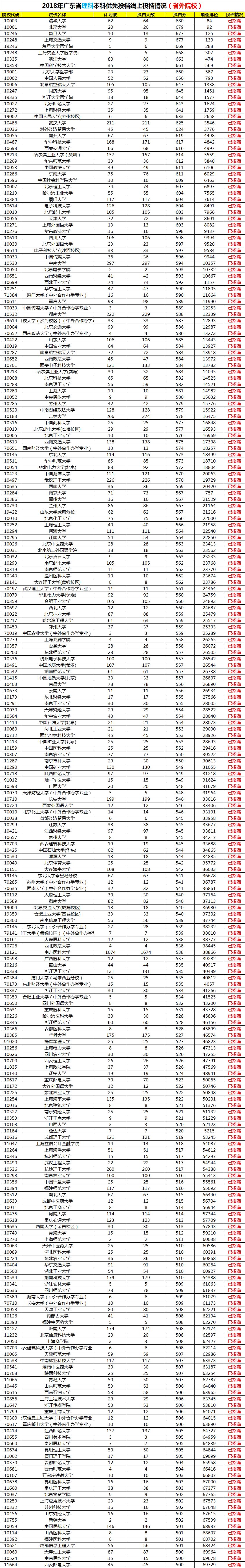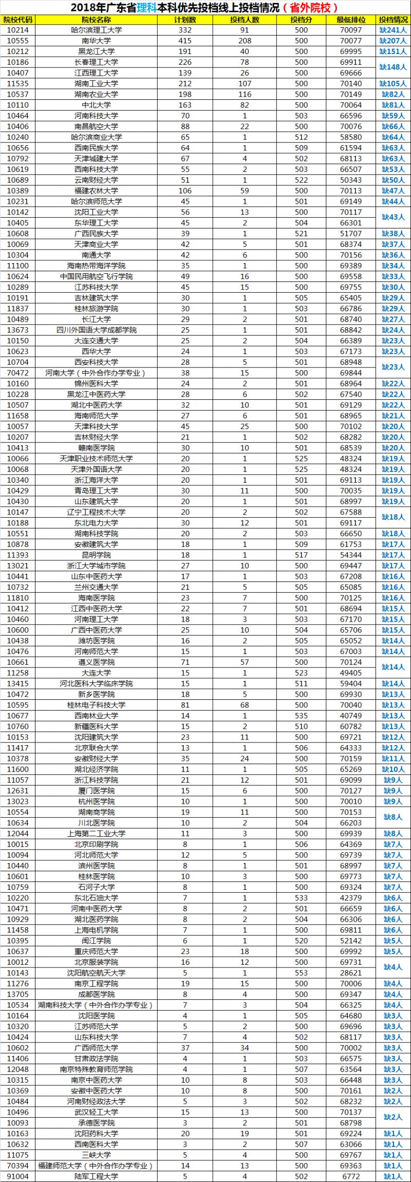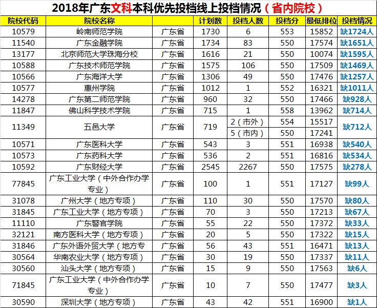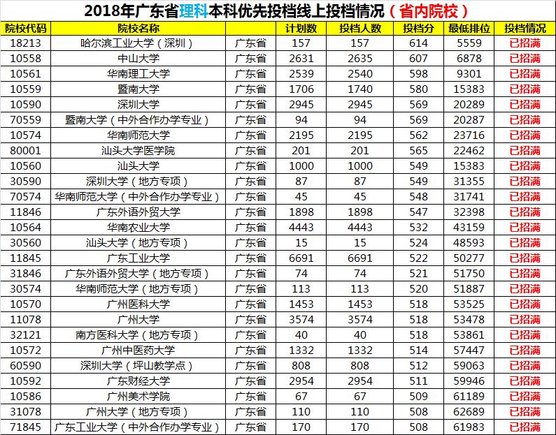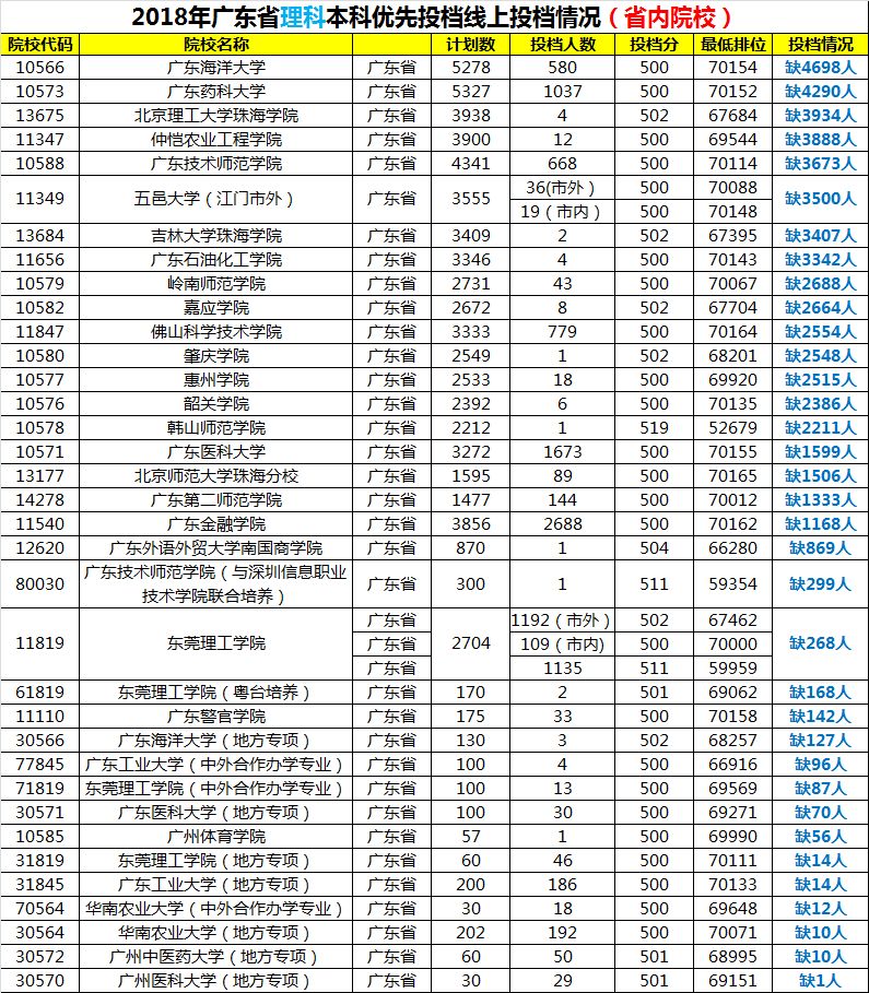 大事 就在今天凌晨的02:39分考试院正式发布了2018年广东省本科优先投档情况。择校菌也通过一个上午的数据处理,为你揭开今年本科优先投档情况,择校菌对数据做了以下处理: 1.分省内院校和省外院校,让同学们更加容易找到自己的报考院校。 2.投档数大于或等于计划数,说明这个学校已经招满。则按照投档分数高低进行排序,被这个学录取难易程度一看便知。 3.投档数小于计划数,说明这个学校没有招满。则按照学校缺档情况从高到低排序,本科第二次投档的同学,报考这个学校还是机会被录取的哟。