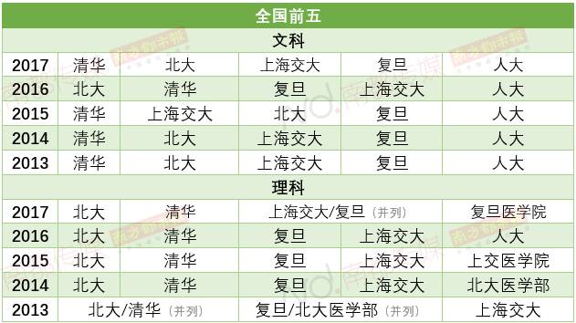 全国高校文科前十:清华、北大、上海交大、复旦、人大位居前五,与去年排序一致。