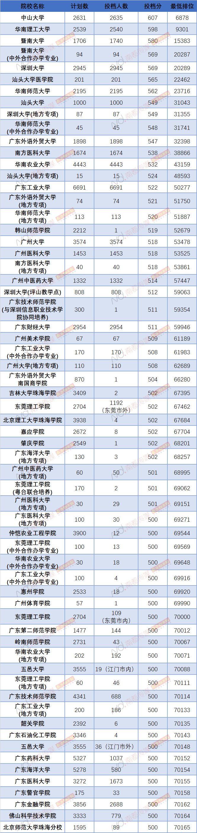 广东高校理科:中大607分、华工598分、暨大580分、深大569分,今年前四名与文科排序一致,紧跟其后的是汕大医学院565分、华师562分、汕大549分、广外547分。