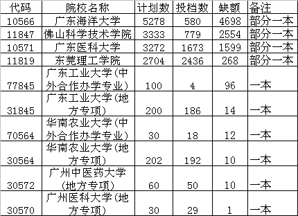 特别说明:这里主要统计广东省内,由于理科东莞理工学院、广东海洋大学、佛山科技学院、广东医科大学有部分专业前两年纳入一本招生,所以按照往常理解,还是有部分专业是属于有优势的一本专业。从表格中看虽然这几个学校理科缺额较多,但是缺额中有很大部分应该还是原来二本专业。如果你是高分退档考生、或者你是低于优先投档线分数较高分考生并且志愿中都填了这些学校,都有机会被录取。