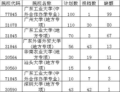 今年广东高考本科志愿实行了平行志愿,而且可填学校大大增多,达到15个,效果出来了,有这么多学校可以填,所以高分优先投档,原来一本高校基本都是在高分优先投档线之上,缺额一本大学专业较往年大大减少,不过还有一小部分缺额。等非高分考生投档或者征集志愿(补录)时解决。请看下表格: