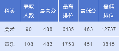 广东省美术类计划招生人数:90人 实际招生人数:90人 广东省音乐类计划招生人数:108人 实际招生人数:108人 注:投档总分为高考文化课总分和术科统考分数合成的,按(文化课成绩*40%+术科统考成绩*2.5*60%)排序情况进行投档。