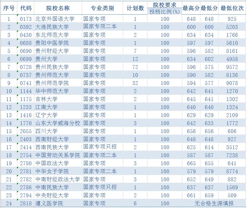 贵州省2018年高考国家专项计划第一次补报志愿投档情况