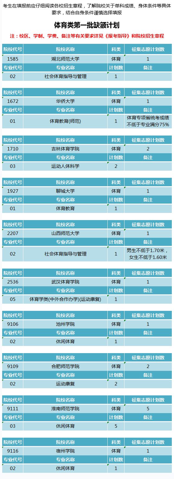 安徽2018体育类第一批(本科)征集志愿缺额计划