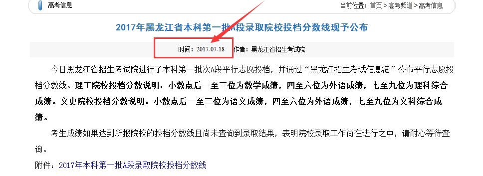 根据小编去年的经验,2017年本科第一批A段录取院校的日程安排与今年相同,而2017年投档分数线在7月18日公布,如果今年没有意外,预计也是在7月18日!当然这也只是小编的推断,最后还是要以黑龙江省招生考试信息港公布的信息为准!