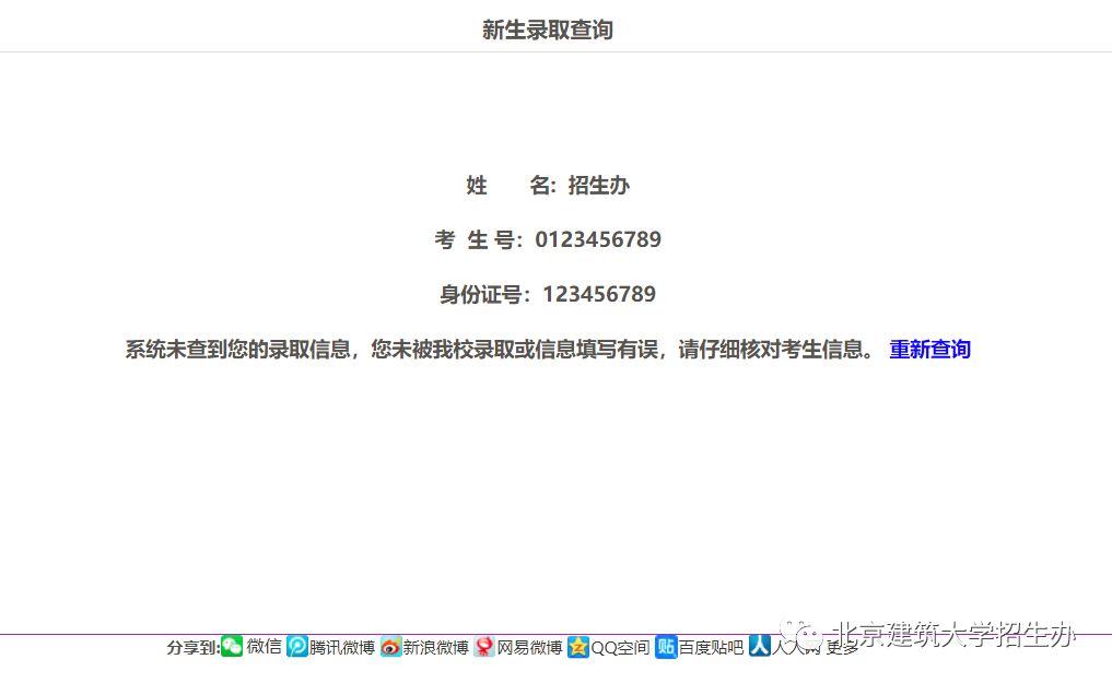 考生查询请登录北京建筑大学招生办公室官方网站,点击首页右下角“新生录取查询”一栏,查询网址为:http://zsb.bucea.edu.cn/files/1/bluewise/linkmaps2.jspx?nodeId=78。请输入“考生姓名+14位考生号+身份证号”查询,未被录取的考生系统将无法显示相关信息,被录取的考生系统会弹出显示相关录取信息界面。