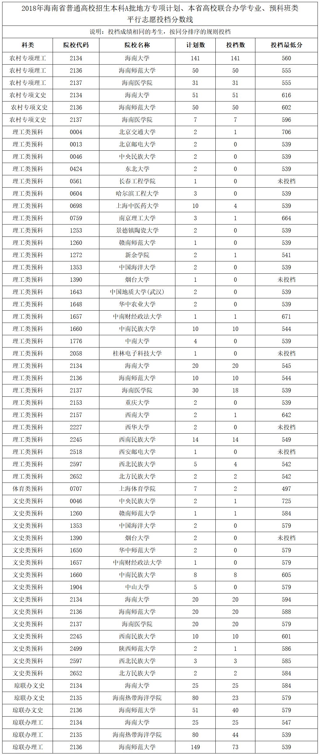 2018年海南省普通高校招生本科A批地方专项计划、本省高校联合办学专业、预科班类平行志愿投档分数线