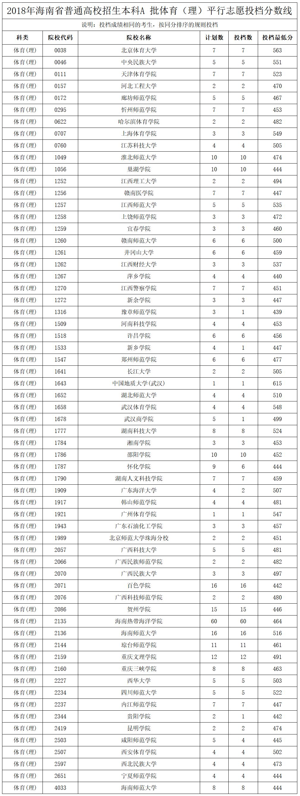 2018年海南省普通高校招生本科A 批体育(理)平行志愿投档分数线