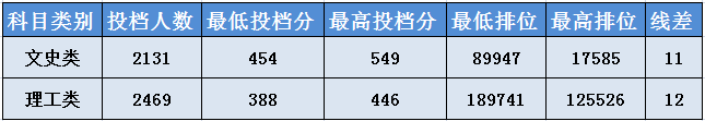 投档情况如下:文科投档人数:2131人,最高排位17585,最高投档分549分,最低排位89947,最低投档分分454分,高出省控线11分;