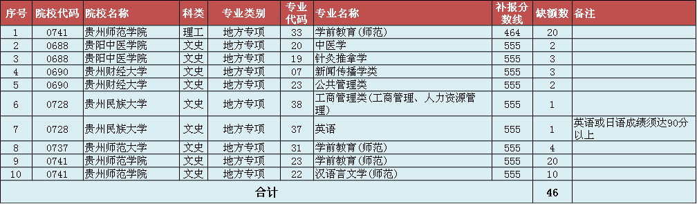 一、文史类高考成绩达到555分,理工类高考成绩达到464分的未被录取考生可根据附表公布的缺额情况补报志愿,考生补报时请仔细查阅《贵州省2018年高考高校招生专业目录》和院校招生章程了解各院校招生专业的特殊要求。