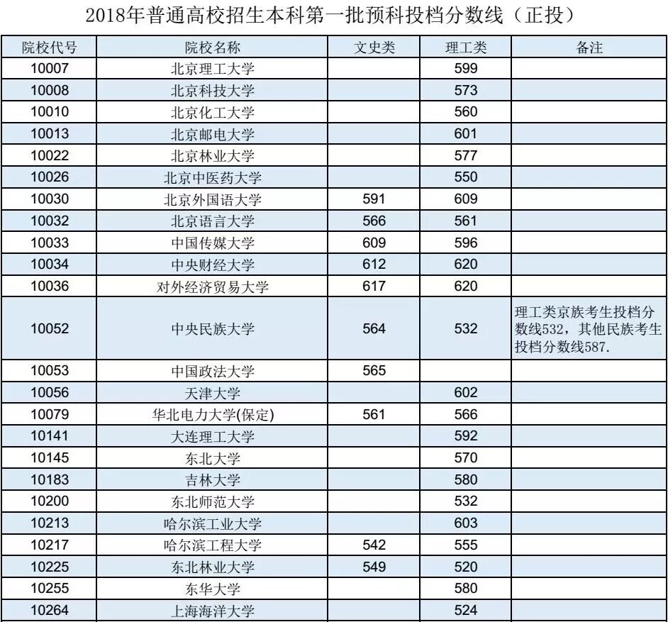 广西2018年普通高校招生本科第一批预科投档分数线(正投)