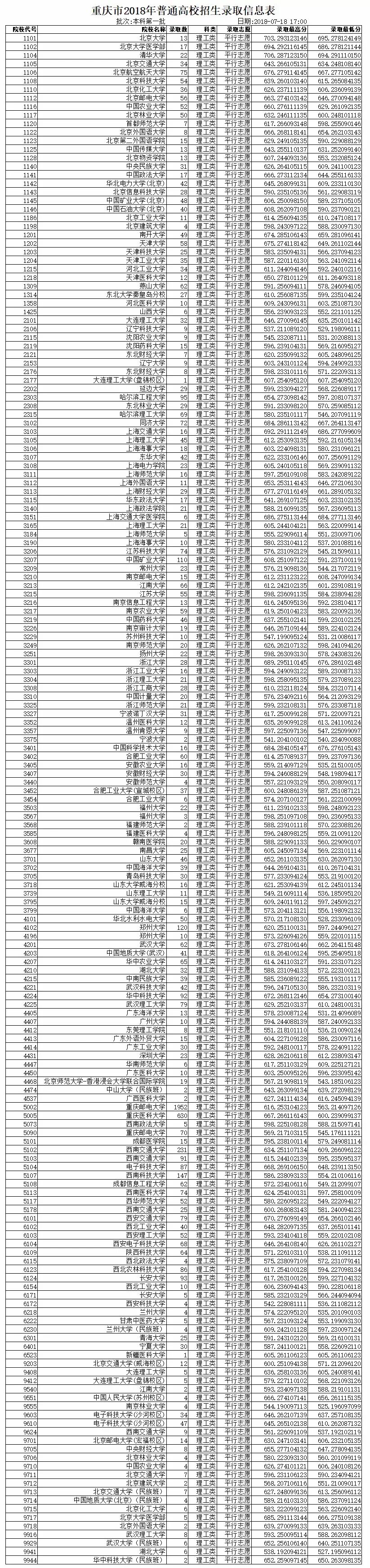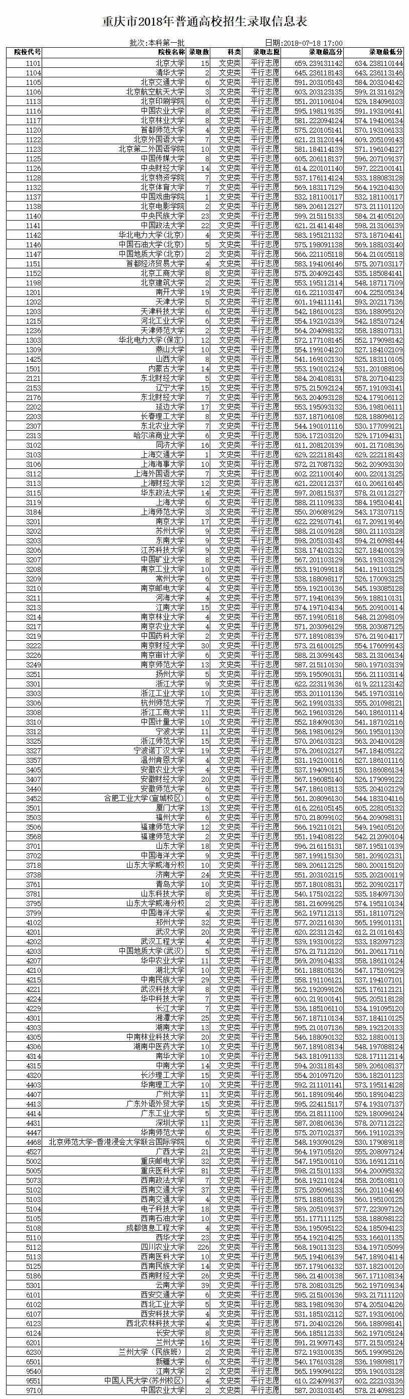 重庆市2018年普通高校招生录取信息表 本科第一批(一)