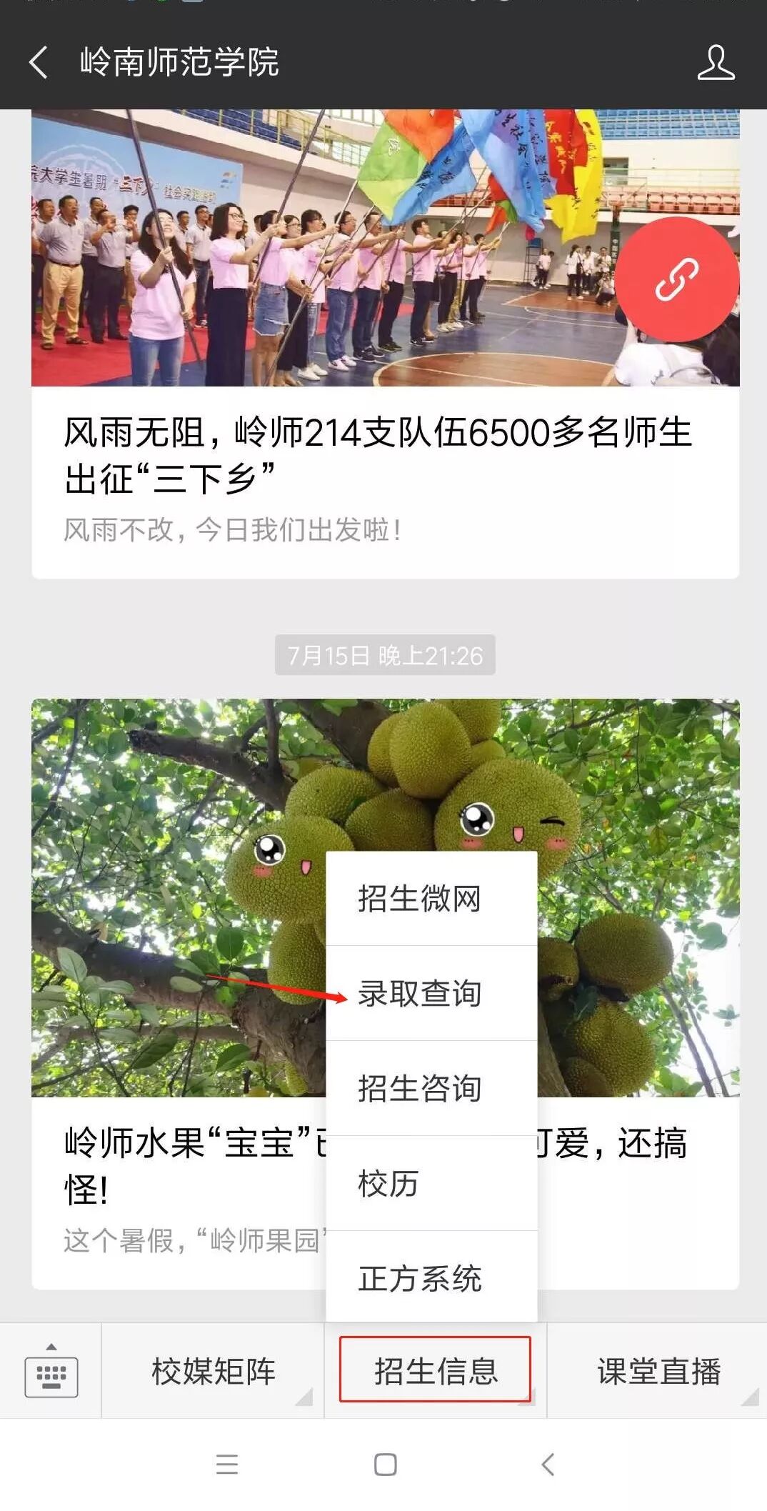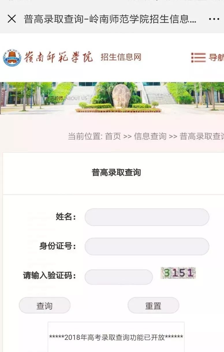录取信息查询方式 方法一: 1.打开学校招生信息网 (点击下方“阅读原文”进入) 2.进入网站首页的“信息查询——普高录取查询”菜单,即可查询。(手机端用户可点击导航进入信息查询) 方法二: 1、关注“岭南师范学院”微信公众号 2、点击下方菜单栏—“招生信息”,即可进入“录取查询” 2018级新生入学报到时间 1、本科生报到时间:9月8日,报到地点:校本部 2、专科生报到时间:9月8日,报到地点:基础教育学院南、北校区 3、本科插班生报到时间:9月1、2日,报到地点:各二级学院办公室