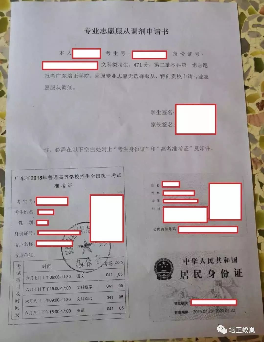 2018年我校受广东考生热捧,文理科一次性超分(文科超27分,理科超18分)满档,但根据录取规则,现拟退不服从专业调剂文科24名、理科35名考生档案。 (名单如下图) 如想申请服从专业调剂,请下载“专业志愿服从调剂申请书”。 请于2018年7月19日下午15:00前按要求将“专业志愿服从调剂申请书”发送到邮箱:pzgo@qq.com。 注意!! 1.请严格按照格式填写申请书! 2.考生与家长签名处,必须手写签名 ! 3.纸质版(可扫描或拍照发送) 请相互告知! 你爱我校,但不服从调剂,我们也无能为力! 专业志愿服从调剂申请书 扫一扫即可下载! 专业志愿服从调剂申请书填写模板 (请严格按照此模板填写) 叶子的离去,是树的不挽留,还是风的追求? ——星星蚁