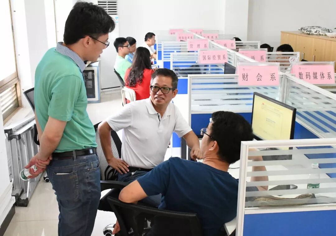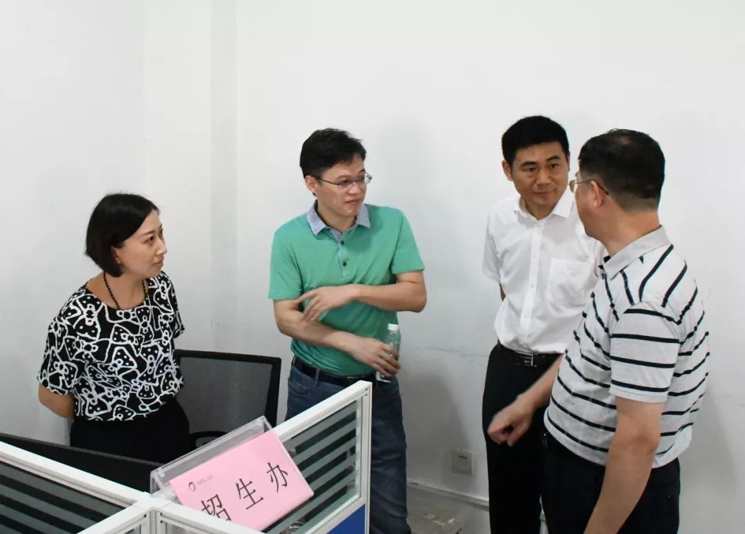学院党委书记刘友坤(右一)、常务副院长迟云平(右二)、党委副书记张高峰(左二)、招生办主任夏丹(左一)谈论招生详情