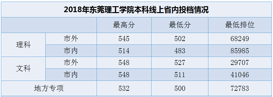 东莞市内生源最低投档分为483分,最低排位为85985,较去年上升13342位。
