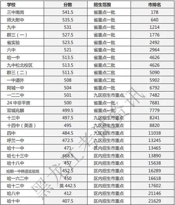 其中,哈三中南岗校区录取分数线比去年低2.5分,一中、六中、九中、师大附中、省实验中学等省重点高中一批次统招录取分数线都低于去年。